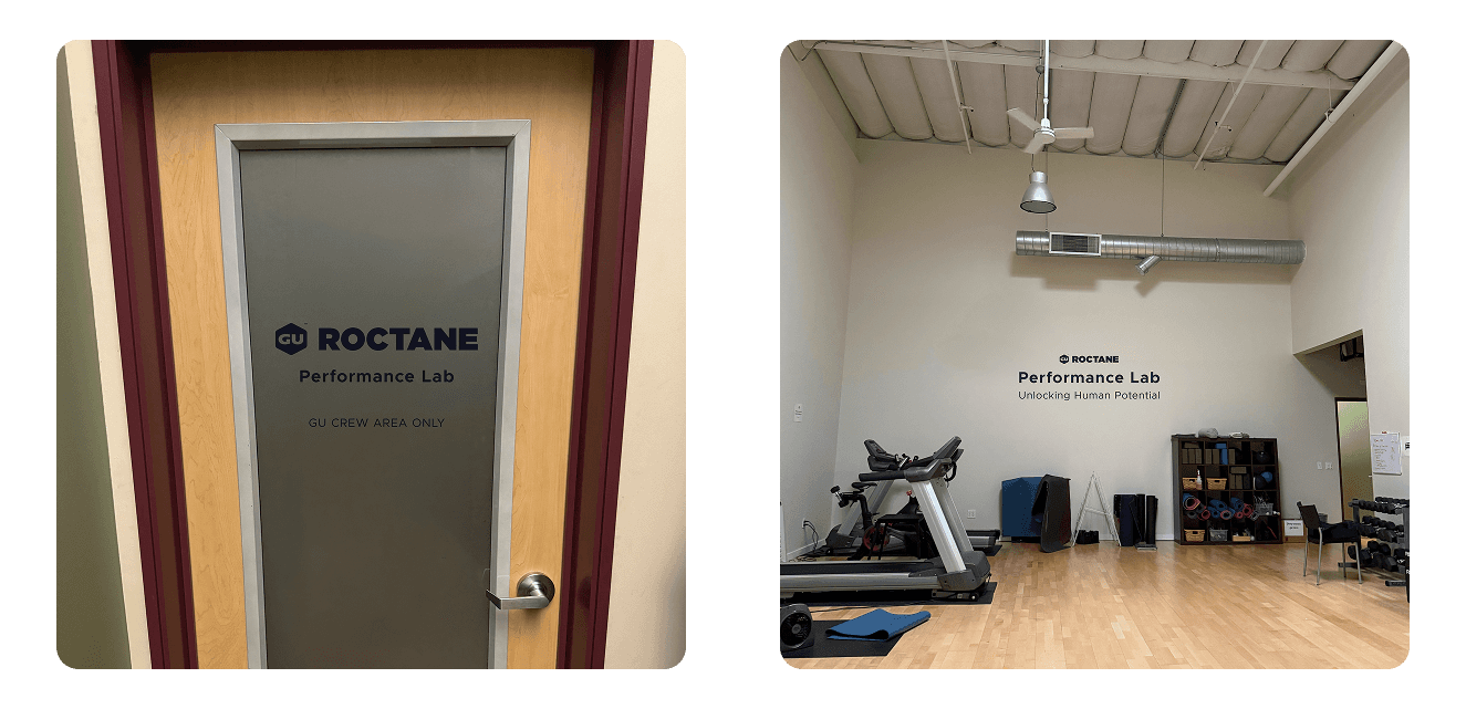 In collaboration with and direction from the R&D team, I designed a large-scale wall graphic for GU's gym and performance lab space - a 40x20-foot feature wall that brings the brand into the physical environment where athletes train and do performance testing. I also designed door signage and a side wall graphic. Each element was built to spec for vinyl application and painting, coordinating with the installation team to ensure the design translated correctly at that scale.